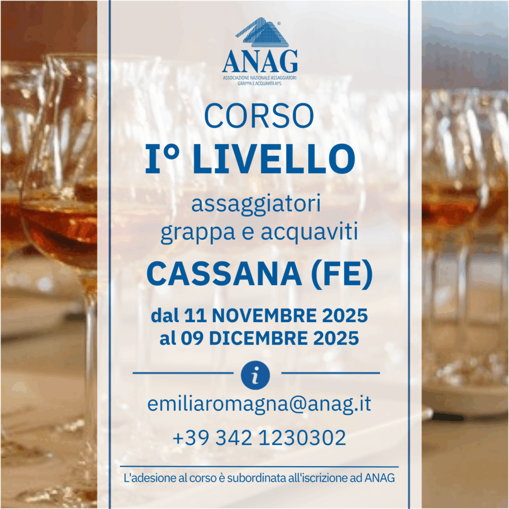 La formazione ANAG riprende anche in Emilia Romagna con un corso di primo livello in programma a Cassana (Ferrara). Le cinque lezioni settimanali previste dal corso sono rivolte ad appassionati e a professionisti del settore della ristorazione che potranno acquisire competenze tecniche e apprendere i segreti della degustazione consapevole attraverso la cultura del “buon bere”. Le lezioni si svolgeranno dall’11 novembre al 9 dicembre, sempre di martedì, dalle ore 20.30 alle 22.30 presso il Circolo La Casona, via Cesare Diana. Gli incontri saranno condotti da esperti docenti ANAG, che guideranno i partecipanti in un percorso sensoriale e formativo arricchito da degustazioni di grappe e acquaviti.